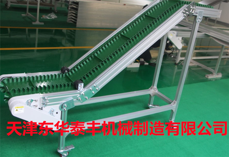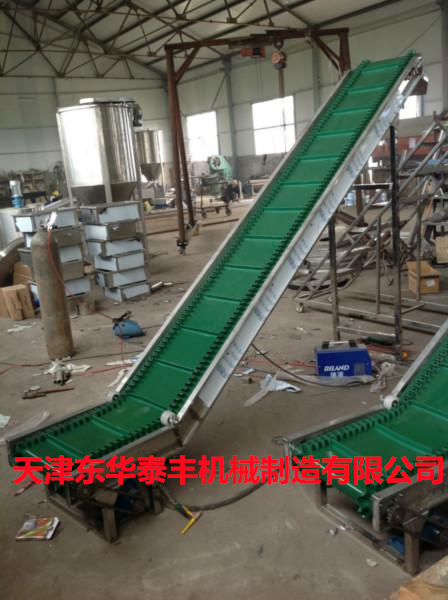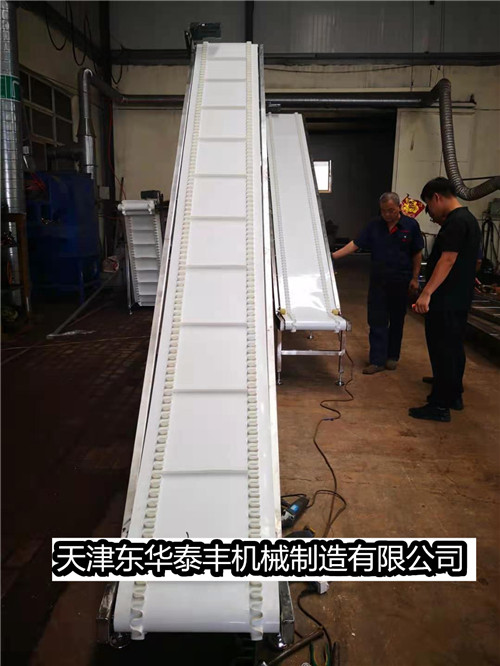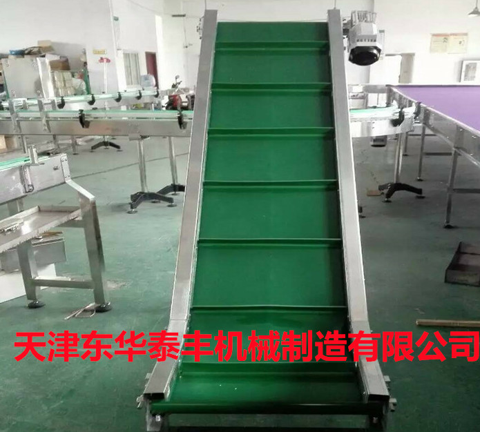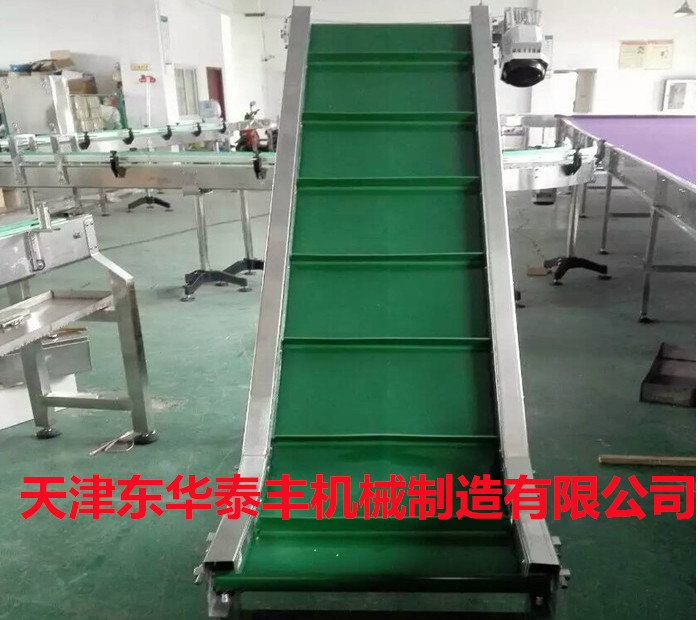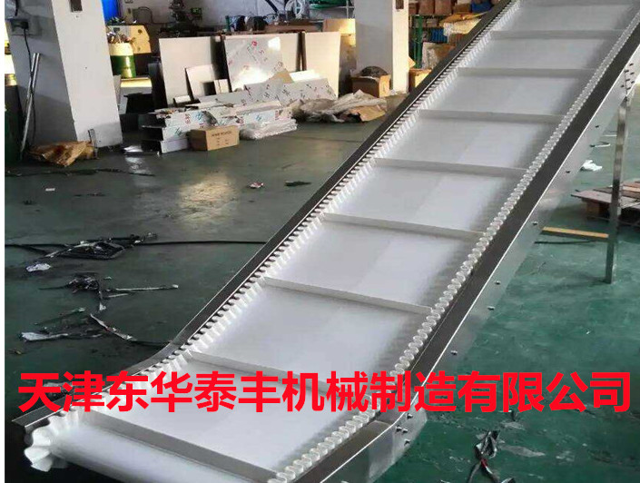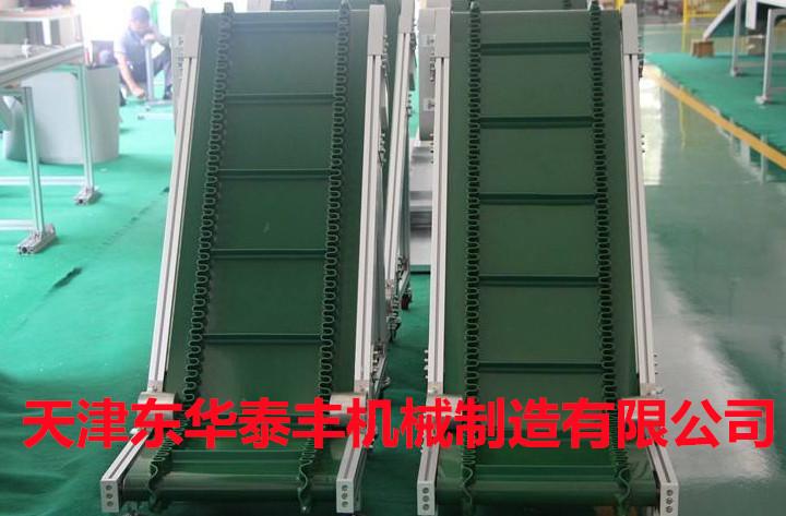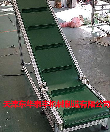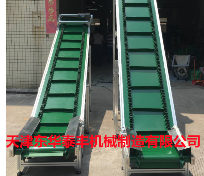 擋板輸送帶和高凸度的一字型花紋輸送帶原理相類似。它就是根據輸送帶的產品規格和功能需求,在合適的橫向剛性平面基帶上按照要求粘接橫向擋板的一種特殊加工輸送帶。它的構成是體現在這三方面: