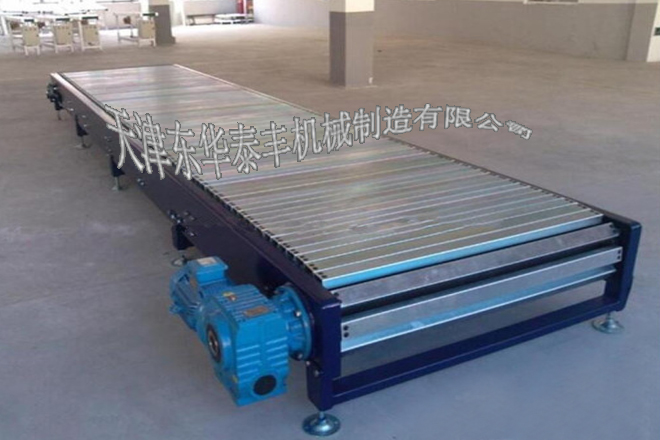 鏈板輸送機以標準鏈板為承載面,由馬達減速機為動力傳動;我們可以通過多列鏈板并行,使鏈板輸送機做的很寬并形成差速,利用多列鏈板的速度差使多列輸送在無擠壓的情況下變為單列輸送,從而滿足飲料貼標、灌裝、清洗等設備的單列輸送的要求,我們可以將兩條鏈板輸送機的頭尾部做成重疊式的混合鏈使得瓶(罐)體處于動態過度狀態,使輸送線上不滯留物料,可以滿足空瓶以及實瓶壓力和無壓力輸送。