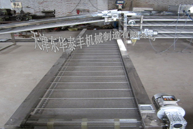 網帶式提升機提升蔬菜、水果等物料。兩種規格:不銹鋼網帶或塑料網帶